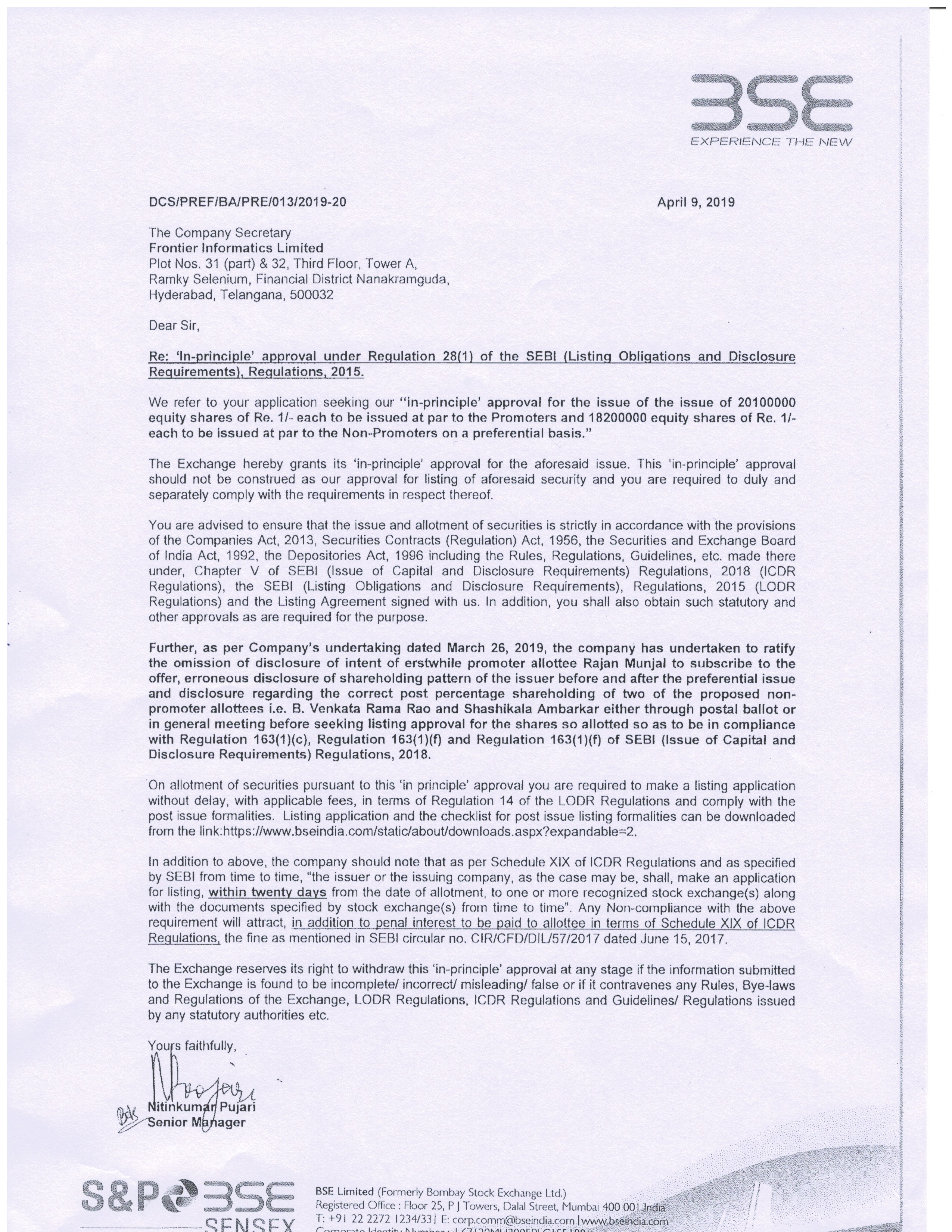 BSE listing approval for preferential allotment | Click Here |